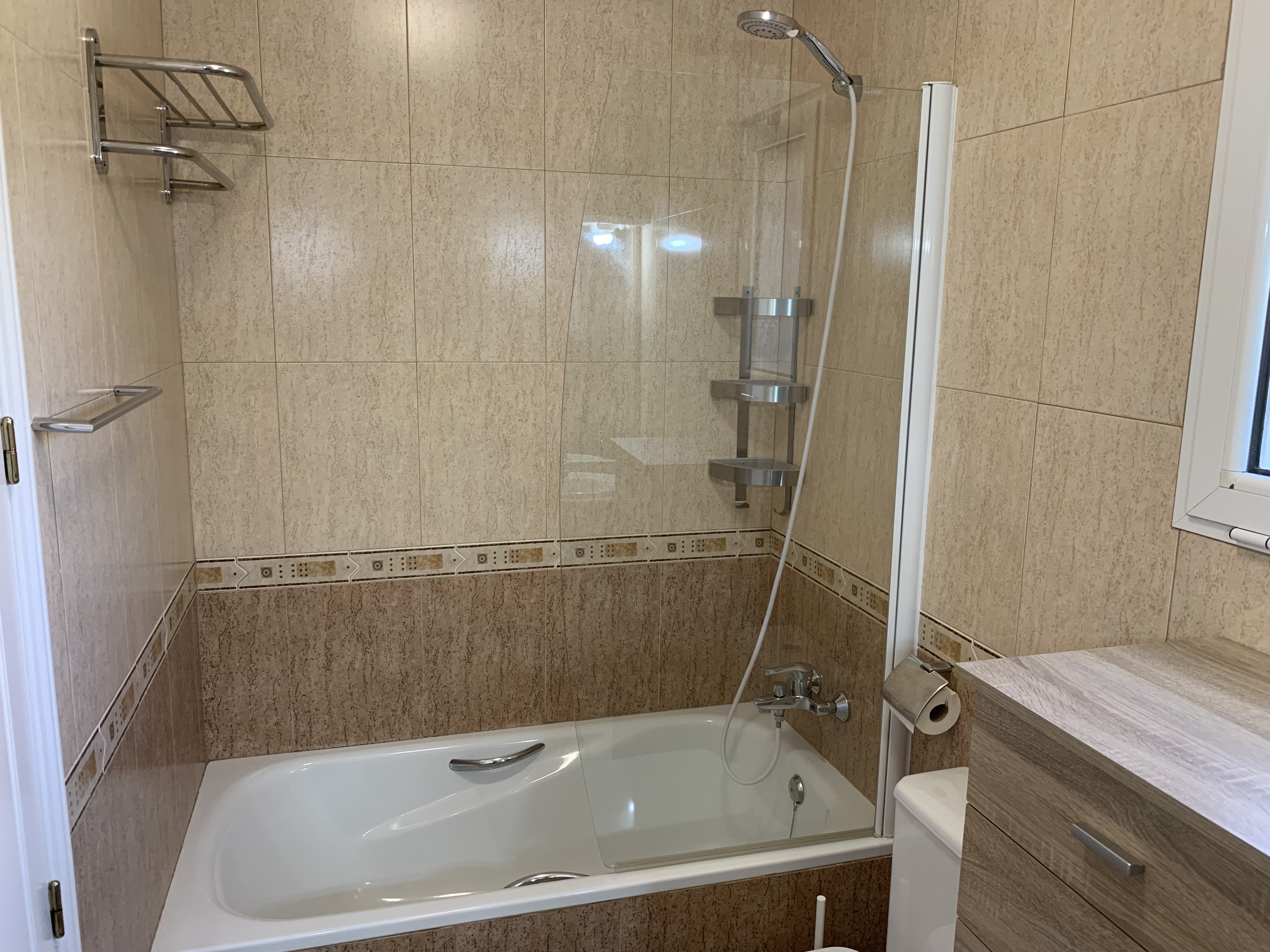 De tweede badkamer is aan de masterbedroom en heeft een ligbad, dubbele lavabo en toilet.